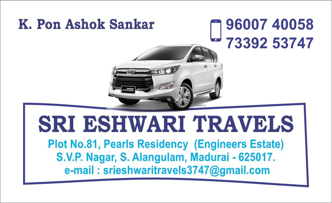 "Best Travel Partner in Madurai".“I always book my tour vehicle rentals in Madurai from SRI ESHWARI TRAVELS. Their fleet includes cars, SUVs, and tempo travellers. They are reliable, and their drivers are friendly and well-mannered. Excellent for family trips and pilgrimages.”